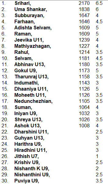 Srihari (from Pondicherry) achieved several notable performances in 2018. The biggest of which is finishing joint fifth(joint second) in the national under 15 championship and getting selected to represent India in an Asian and World Youth team championship. Results below…
